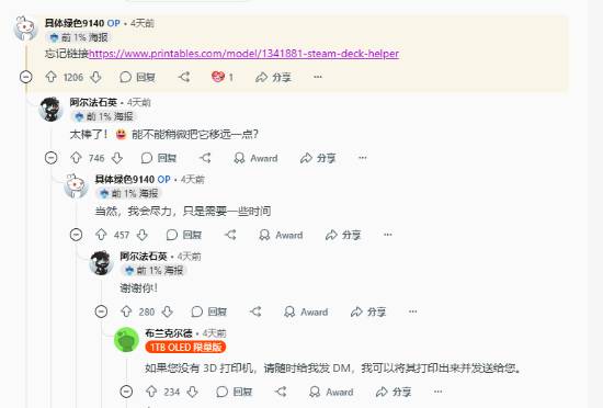 这项设计令Alpha-Quartz十分欣喜嘉创配资,而后还有热心的玩家表示“如果您没有3D打印机,请告诉我,我可以将其打印出来并发送给您。”也有玩家在此基础上设计出了优化的版本。