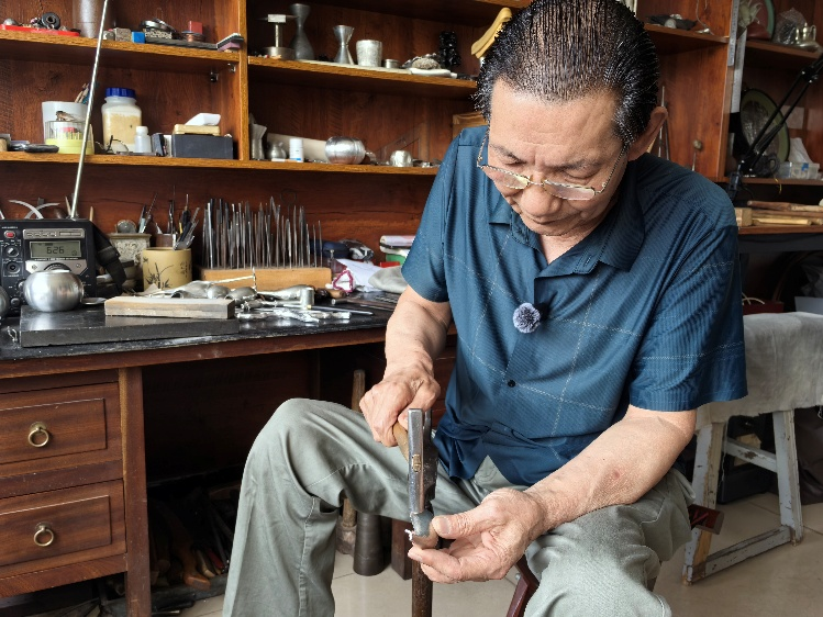 工作室里,王圣良一手承托锡料,一手执锤轻落。锤尖点在砧台上,锡料应声绽开浅淡而清晰的印记,力道精妙如毫巅,仿佛初春湖面被微风拂过的第一缕涟漪,既是创造的序章,亦是万千繁复纹样诞生的原点。当两片锡料需交融一体,他拈起烙铁,蘸取备好的松香,在接缝处细细点染。“唯有用同一块锡料熔成的焊料,才能让接口消弭无踪,宛若天成。”老人的话语沉静,却蕴藏着对工艺极致的苛求。