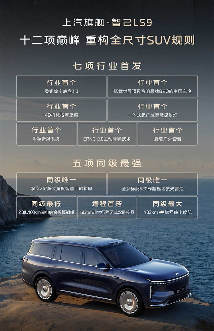 此外,新车还具备同级唯一双向24°智慧四轮转向、同级唯一全系标配520线超视域激光雷达、同级最低2.81L/100km油电综合折算能耗,并且增程车型首搭150mm行程闭式双腔空悬、以及同级最大402km CLTC增程纯电续航。