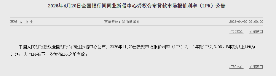 4月20日,中国人民银行授权全国银行间同业拆借中心公布,贷款市场报价利率(LPR)为:1年期LPR为3.0%,5年期以上LPR为3.5%。以上LPR在下一次发布LPR之前有效。