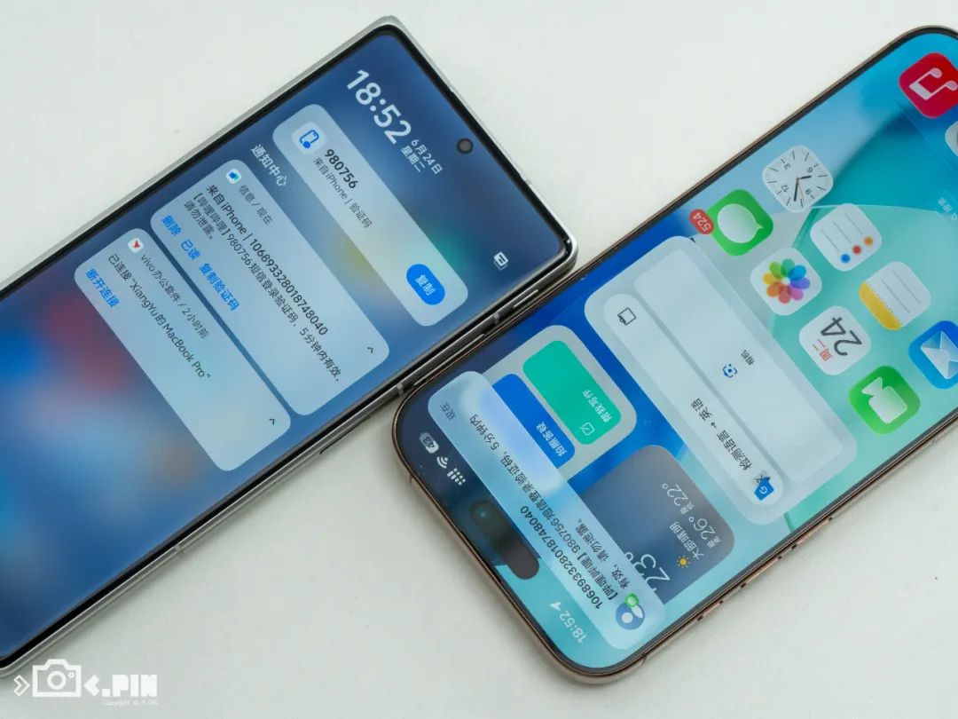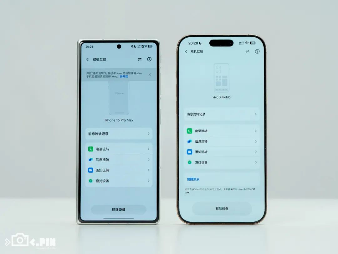 另外它也支持跟 iPhone 的配对,iPhone 上的电话、短信、通知都可以无缝流转到 vivo X Fold5 上。