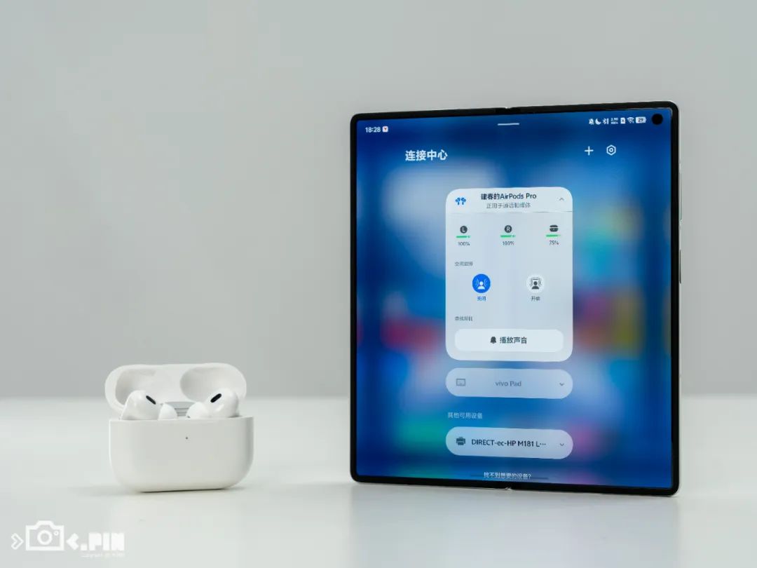 连上 AirPods 后,不用借助任何第三方软件,我们在 vivo X Fold5 状态栏里,就能看到耳机的剩余电量,同时它还支持空间音频,也能随意切换耳机模式,就这体验,已经足够媲美原生。