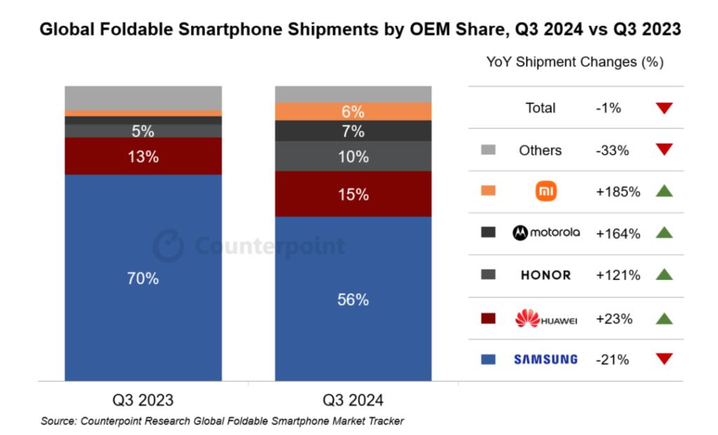 不过去年第三季度,全球折叠屏智能手机出货量却首次出现了下滑,同比下降了 1%。