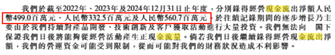 公司在申请文件中表示:过往业绩显示公司处于亏损状态且经营现金流出净额持续,2022-2024年经营现金流出净额分别为4.99亿元、3.33亿元及5.61亿元。未来若不能改善盈利状况与现金流,运营资金将受限制。