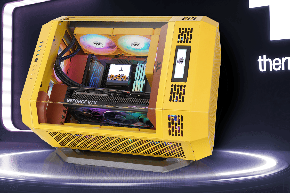 透视 The Tower 600 机箱本身IT之家此前已有介绍,其采用左前、前、右前三面玻璃设计,搭配另购的机箱支架后支持水平横躺,也可另购底部 3.9 英寸 LCD 屏幕配件组。