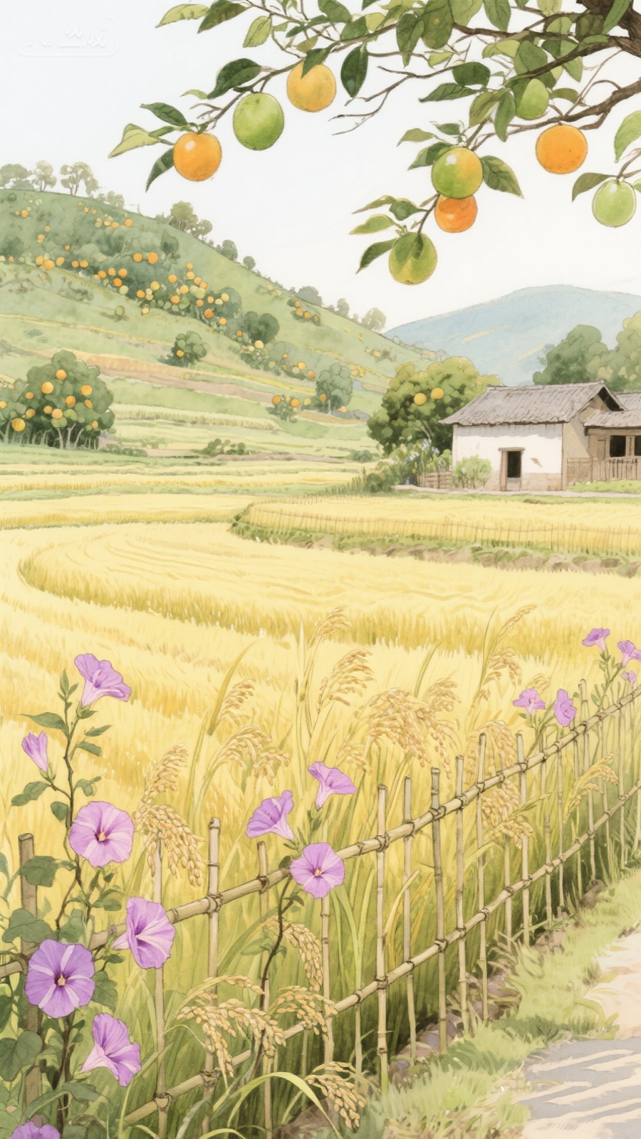 词的上片,用寻常景物织就了一幅秋收图,以远到近视角勾勒秋景。“十里西畴熟稻香”未写稻穗形态,以“熟香”破题,让读者通过嗅觉感知丰收,又留足想象空间。转而写槿花与竹丝,以色彩与动态,平衡稻田的沉静,使秋收多了几分灵动。“垂垂山果挂青黄”更见巧思,“青黄”二字不只是色彩描写,更暗合果实从青涩到成熟的过程,让秋实的鲜活跃然纸上。