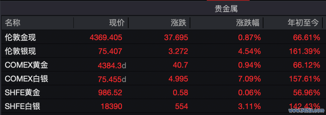 国际金银价格在大跌后企稳回升。截至发稿,伦敦金现报4369美元/盎司,日内涨0.87%。伦敦银现报75.4美元/盎司,日内涨逾4.5%,COMEX白银更是涨超7%。