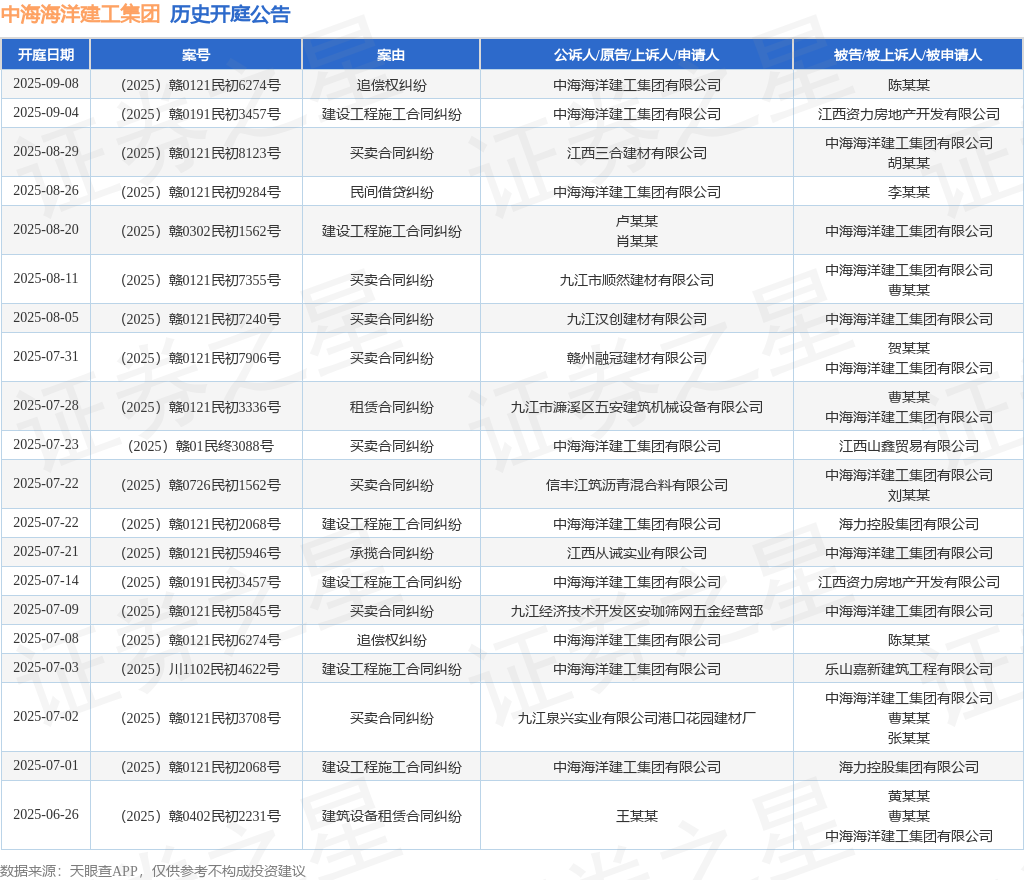 案号:(2025)赣0121民初7240号审理法院:南昌县人民法院案由:买卖合同纠纷当事人信息: 原告/上诉人:九江汉创建材有限公司 被告/被上诉人:中海海洋建工集团有限公司开庭日期:2025年8月5日根据统计,近一年内以中海海洋建工集团有限公司为当事人的历史开庭公告有91则,其中案由为“买卖合同纠纷”的公告以36则居首,其次为“建设工程施工合同纠纷”有22则,“租赁合同纠纷”有6则。历史开庭公告(前20条)如下: